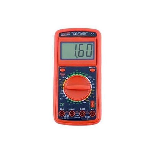 MULTÍMETRO DIGITAL MOD.MD-360 3½ DÍG. PARA TENSÃO, CORRENTE, RESISTÊNCIA, CAPACITÂNCIA, DIODO E TRANSISTOR (HFE) DESCRIÇÃO: Multímetro digital mod.md-360 3½ díg. para tensão, corrente, resistência, capacitância, diodo e transistor (hfe) ESPECIFICAÇÕES TÉCNICAS: Display: LCD 3 ½ dígitos 2000 contagens Display inclinável até 90º Taxa de amostragem: 2/3 vezes por segundo Tensão DC: 200mV, 2V, 20V, 200V, 1000V Resolução: 100mV, 1mV, 10mV, 100mV, 1V Precisão: ± 0,5% da leitura + 1 dígito Tensão AC: 200mV, 2V, 20V, 200V, 750V Resolução: 100mV, 1mV, 10mV, 100mV, 1V Precisão: ± 0,8% da leitura + 3 dígitos Corrente DC: 2mA, 20mA, 200mA, 20A Resolução: 1µA, 10µA, 100µA, 10mA Precisão básica: ± 1,3% da leitura + 1 dígito Corrente AC: 2mA, 20mA, 200mA, 20A Resolução: 1µA, 10µA, 100µA, 10mA Precisão básica: ± 1,9% da leitura + 3 dígitos Resistência: 200?, 2K?, 20K?, 200K?, 2M?, 20M?, 200M? Resolução: 0,1?, 1?, 10?, 100?, 1k?, 10k? Precisão básica: ± 1% da leitura + 2 dígitos Capacitância: 20nF, 200nF, 2mF, 20mF, 50mF Precisão: ± 2,5% de leitura + 1 dígito. Tempo de Resposta: 2 a 3 vezes por segundo Zero automático de medição de capacitância Botão Hold: Congelamento de leitura das escalas Teste de diodo, transistor (hFE) 0~1000 e continuidade audível (Bip) Indicação de sobre-escala: "1" aparece no display Indicação automática de polaridade negativa Indicação de bateria fraca Temperatura de Operação: 0 a 40ºC Temperatura e umidade de armazenamento: -10º a 50ºC / 75% Categoria de Segurança: CAT II – 600V CAT III - 220V Alimentação: 1 Bateria de 9V Dimensões: 88 x 172 x 36mm Desligamento automático Peso: 340g ACESSÓRIOS FORNECIDOS: Multímetro digital MD-360 Bateria de 9V Holster Pontas de prova Manual de instruções