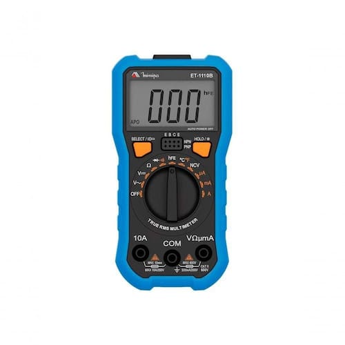 Multimetro Digital True Rms Et-1110b O modelo ET-1110B é um multímetro compacto, prático e de fácil manuseio. Ele faz medições de corrente AC/DC, tensões AC/DC, resistência, temperatura, teste de diodo, continuidade e hFE. Além das funções de desligamento automático, data HOLD e NCV. Display: 3 1/2 Dígitos, 2000 Contagens| Indicação de Polaridade: Automática| Mudança de Faixa: Automática| Indicação de Sobrefaixa: Indica OL no display| Taxa de Amostragem: Aprox. 3 vezes por segundo| Indicação de bateria fraca: Luz de Fundo e Lanterna| Data Hold| Medição de Temperatura| Função NCV| Teste de hFE| Desligamento Automático (APO 15 minutos / off)| Ambiente de Operação: 0 a 40C, U.R.<80%| Armazenamento: -10 a 50C, U.R.<80%| Alimentação: 2 x 1,5V AAA| Autonomia: Aproximadamente 200 horas para Bateria alcalina e 100 horas para bateria de carbono| Conformidade: IEC61010 CAT II 600V| O modelo ET-1110B é um multímetro compacto, prático e de fácil manuseio. Ele faz medições de corrente AC/DC, tensões AC/DC, resistência, temperatura, teste de diodo, continuidade e hFE. Além das funções de desligamento automático, data HOLD e NCV. Display: 3 1/2 Dígitos, 2000 Contagens| Indicação de Polaridade: Automática| Mudança de Faixa: Automática| Indicação de Sobrefaixa: Indica OL no display| Taxa de Amostragem: Aprox. 3 vezes por segundo| Indicação de bateria fraca: Luz de Fundo e Lanterna| Data Hold| Medição de Temperatura| Função NCV| Teste de hFE| Desligamento Automático (APO 15 minutos / off)| Ambiente de Operação: 0 a 40C, U.R.<80%| Armazenamento: -10 a 50C, U.R.<80%| Alimentação: 2 x 1,5V AAA| Autonomia: Aproximadamente 200 horas para Bateria alcalina e 100 horas para bateria de carbono| Conformidade: IEC61010 CAT II 600V| Marca: Não Informado Ean: 7908157100464