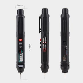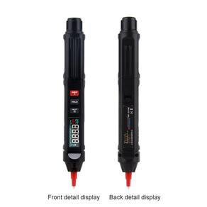 ?VISÃO GERAL?6000 contagens é um valor efetivo real de bolso de 3 5/6 dígitos, multímetro inteligente tipo caneta, sem necessidade de girar o botão para selecionar a função. De acordo com a tensão/resistência/diferença de entrada, o medidor identificará e medirá automaticamente, o desempenho desta máquina é estável, de alta precisão, alta confiabilidade, leitura clara e função de proteção contra sobrecarga. Alimentado por uma bateria AAA de 1,5 V, este medidor usa um grande display LCD e aumenta a fonte de alimentação. Mesmo à beira de uma bateria fraca de 0,8 V. Este medidor é fácil de transportar e é um medidor que a maioria dos usuários realmente gosta. Esta série de medidores pode identificar automaticamente tensão DC, tensão AC, resistência, sem qualquer alteração, e também pode ser comutada manualmente para medir capacitância, diodo, teste de continuidade, medição de tensão sem contato, medição de linha ativa zero, sequência de fase de medição e outros parâmetros. É um medidor de ferramentas com desempenho superior, uma ferramenta ideal para laboratórios, fábricas, entusiastas de rádio e famílias? ?Precauções de segurança Esta série de medidores foi projetada em conformidade com a IEC1010 (padrões de segurança). segurança aprovada pela Comissão Eletrotécnica Internacional). Por favor, leia as precauções de segurança antes de usar. 1. Ao medir a tensão, não insira uma tensão limite que exceda o valor efetivo de DC1000V ou AC 700V; 2. A tensão abaixo de 36V no arquivo atual é uma tensão segura; 3. Ao alterar as funções e os intervalos, os cabos de teste devem sair do ponto de teste; 4. Escolha a função e o alcance corretos e tenha cuidado com a operação incorreta. Embora esta série de instrumentos tenha proteção de alcance total, por razões de segurança, preste mais atenção;?Característica 1. Características gerais 1-1. Modo de exibição: display de cristal líquido; 1-2 display máximo: 5999 (3 5/6) display automático de polaridade; 1-3 Método de medição: conversão integral A/D dupla; 1-4. Taxa de amostragem: cerca de 3 vezes por segundo; 1. Display de baixo alcance: A posição mais alta exibe “OL”; 1-6. Ambiente de trabalho: (0 ~ 40) ?, umidade relativa Veja menos