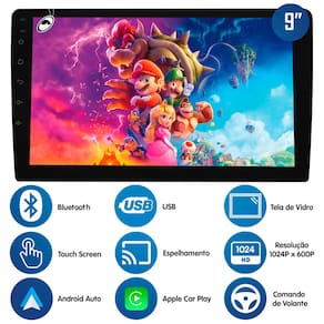 PRINCIPAIS CARACTERÍSTICAS: - Tela 9" Polegadas Full Touch - Tela de Vidro 2.5D - Espelhamento de celular Android e IOS - Função Android Auto e CarPlay conectividade com e sem fio - Bluetooth 4.1 - Radio FM - Resolução da imagem 1024x600 - Equalizador JAZZ/POP/CLASSIC/ROCK - Potência 4x60 RHMS - 2 Entradas USB - 1 Entrada para camera de ré - 1 Entrada de audio e vídeo - 1 Saída de audio e vídeo - 1 Entrada para microfone externo - 1 Saída de Subwoofer - 2 Fios SWC para comando de volante (Grava até 10 Funções) - Saída de Vídeo (quando a saída de vídeo para o encosto de cabeça, apenas o encosto de cabeça tem exibição de vídeo).