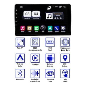 PRINCIPAIS CARACTERÍSTICAS: - Multimídia Android Full Touch; - Tela 9 Polegadas de Vidro; - Android Auto com e sem fio; - CarPlay com e sem fio; - Memória Ram: 2GB; - Memória Internos: 32GB - Bluetooth; - Resolução de Imagem 1024x600; - Sistema Operacional: Android; - 2 entradas USB; - 1 Entrada para Câmera de Ré; - 1 Entrada de Áudio e Vídeo; - 1 Saída de Áudio e Vídeo; - 1 Saída de Subwoofer; - GPS online; - Wifi Integrado; - Processador Quad-core; - Potência 4x60W RMS;