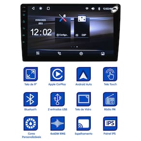 PRINCIPAIS CARACTERÍSTICAS: - Tela 9" Full Touch; - Tela de Vidro; - Espelhamento de celular Android e IOS; - Função Android Auto e CarPlay conectividade sem fio; - Bluetooth: ligação e reprodução de músicas; - Radio FM; - Resolução da imagem 1024x600; - Equalizador JAZZ/POP/CLASSIC/ROCK; - Potência 4x60W RMS; - 2 Entradas USB; - 1 Entrada para camera de ré; - 1 Saída de audio e vídeo; - 1 Entrada para microfone externo; - 1 Saída de Subwoofer; - 2 Fios SWC para comando de volante (Grava até 10 Funções); - Saída de Vídeo (quando a saída de vídeo para o encosto de cabeça, apenas o encosto de cabeça tem exibição de vídeo).