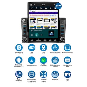 CARACTERÍSTICAS TÉCNICAS: - Entretenimento a Bordo: A multimídia 9 Polegadas proporciona entretenimento para motoristas e passageiros por meio de rádio, reprodução de músicas e vídeos; - Conectividade Bluetooth: Permite que os motoristas conectem seus dispositivos móveis ao sistema do carro para fazer chamadas com viva-voz e reproduzir músicas; - Câmera de Ré: Melhora a segurança durante manobras de estacionamento, fornecendo uma visão clara da parte traseira do veículo; - Integração de Smartphones: Suporta integração de smartphones, como Apple CarPlay e Android Auto, para acesso a aplicativos e funções do telefone. Um sistema multimídia para carros oferece uma variedade de soluções e recursos para melhorar a experiência de condução e entretenimento dentro do veículo.