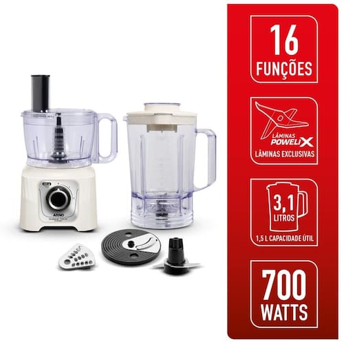Com suas 16 funções, você terá muita praticidade e versatilidade para suas receitas, podendo bater massas pesadas e leves, ralar legumes duros e macios, picar legumes e carnes, liquidificar alimentos e muito mais!