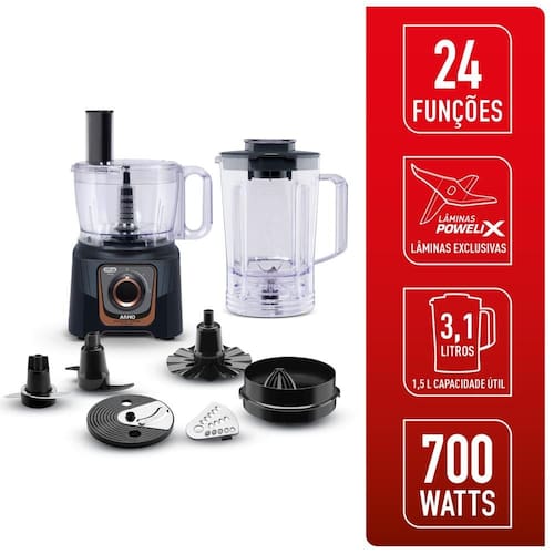 O multiprocessador Arno Multichef oferece 24 funçoes, conta com 700W de potência, 2 velocidades e 7 acessórios, permitindo picar, ralar, fatiar, bater massas, espremer sucos e liquidificar alimentos, para receitas mais práticas e rápidas.