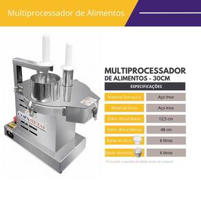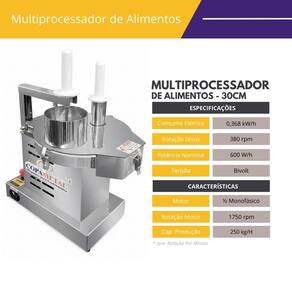 Multiprocessador de Alimentos Industrial com 6 Discos FC2Precisa ganhar tempo e aumentar a produção da sua cozinha industrial? Em algum momento, todo mundo que trabalha com produção de alimentos vai precisar ralar, desfiar ou fatiar algo. Imagine o tempo gasto para realizar este processo manualmente. O multiprocessador de alimentos industrial em inox da FC2 fará tudo isso por você em segundos. O multiprocessador de alimentos industrial em inox da FC tem a capacidade de produção de 250kg/h e conta com 6 discos sendo: 1 Disco Ralador 1 Disco Fatiador Fino de 1,5mm1 Disco Fatiador Grosso de 3m1 Disco Fatiador Ondulado de 3mm 1 Disco Desfiados Fino de 5mm 1 Disco Desfiador Grosso de 8mmFinalidades dos discos:Disco Ralador: Queijos, presuntosDisco Desfiador Fino: Mussarela, presunto, calabresa, cenouraDisco Desfiador Grosso: Mussarela, presunto, cenouraDisco Fatiador Grosso: Batata, tomate, cenouras, beterraba, calabresaDisco Fatiador Fino: Batata, cenouras, calabresa, repolho, beterrabasDisco Fatiador Ondulado: Batatas, cenouras, abobrinhas, beterrabasPensando na segurança do usuário, este produto dispõe de um botão com sistema "desarme", que pode ser acionado sempre que necessário Características Técnicas do Multiprocessador de Alimentos IndustrialVoltagem: 127vMotor: 1/2 CV MonofásicoPotência: 360wConsumo: 0,37 kw/hRotação: 375 rpmProdução: 250kg/hModelo: MPAIProduto segue todas as normas e exigências do INMETRO.Medidas do Multiprocessador de Alimentos IndustrialAltura: 46,5cmLargura: 36cmProfundidade: 63,5cmPeso: 26 kgBocal Maior: 12,3cmBocal Menor: 4,8cmGarantia 6 meses contra defeito de fabricação
