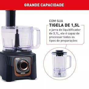 O processador conta com uma tigela de 1,5L, perfeita para preparar cremes, molhos