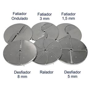 Esse Multiprocessador conta com 6 discos, são eles: fatiador 1,5mm e 3mm, fatiador em ondas, ralador, desfiador de 5mm e 8mm. Com isso aumentando a produtividade de sua empresa e reduzindo o tempo de pré-preparo dos alimentos.