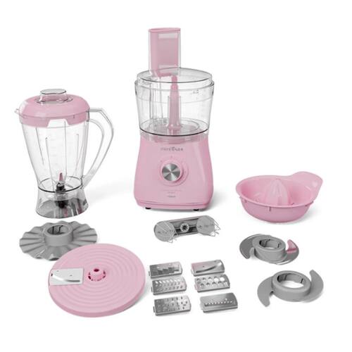 O Multiprocessador Britânia na cor Rosa 127V vai deixar sua cozinha ainda mais completa e funcional. Com 12 funções em um único aparelho, 1000W de potência e 2 velocidades + pulsar, o Multiprocessador Britânia garante que suas receitas sejam preparadas com rapidez e eficiência, seja para picar, triturar, fatiar ou misturar. Os diferentes acessórios que o acompanham, fazem dele um produto completo. As lâminas de corte palito, corte ondulado, ralar fino, granular, fatiar 1,2 mm, ralar e fatiar, juntamente com o disco emulsificador e batedor de massas leves, proporcionam uma infinidade de texturas e cortes dos alimentos. O Multiprocessador Britânia também vem com uma jarra de processador com capacidade de 1,25L, perfeita para preparar quantidades maiores de alimentos. Além disso, acompanha um copo de liquidificador com capacidade total de 2,2L e útil de 1,5L, ideal para receitas líquidas, smoothies, sucos e muito mais. Seja para o preparo de refeições diárias ou de ocasiões especiais, conte com Multiprocessador 12 em 1 Rosa.