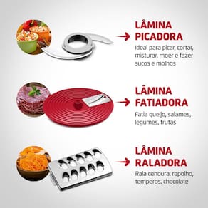 - Processador 5 em 1: Inclui jarra do liquidificador, lâmina picadora, fatiador, ralador e filtro do liquidificador