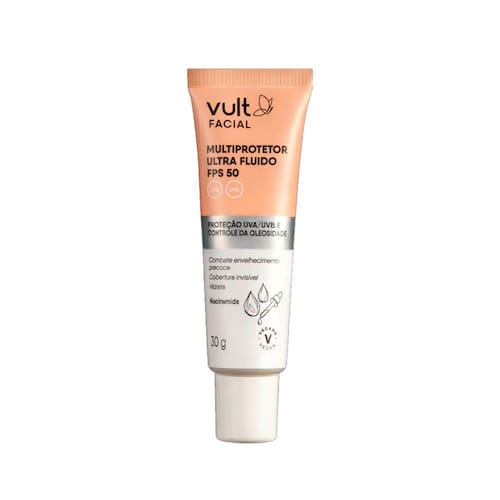 O Multiprotetor Solar Facial Vult Fps 50 30g protege a pele contra danos do sol e o envelhecimento precoce. Além de proporcionar proteção multinível (UVA + UVA logo + UVB) e 48 horas de hidratação, sem obstruir os poros nem deixar resquícios brancos. Possui textura ultra fluida com acabamento matte de cobertura invisível que não escorre, não craquela a base e nem esfarela a maquiagem. Pode ser utilizado por todos os tipos de pele, inclusive as oleosas, deixando uma sensação de pele limpa por 12 horas.