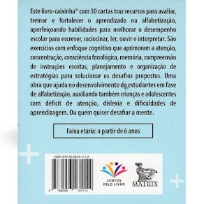Este livro-caixinha® com 50 cartas traz recursos para avaliar, treinar e fortalecer o aprendizado na alfabetização, aperfeiçoando habilidades para melhorar o desempenho escolar para escrever, raciocinar, ler, ouvir e interpretar. São exercícios com enfoque cognitivo que aprimoram a atenção, concentração, consciência fonológica, memória, compreensão de instruções escritas, planejamento e organização de estratégias para solucionar os desafios propostos. Uma obra que ajuda no desenvolvimento de estudantes em fase de alfabetização, auxiliando também crianças e adolescentes com déficit de atenção, dislexia e dificuldades de aprendizagem. Ou quem quiser desafiar a mente. Faixa etária: a partir de 6 anos