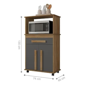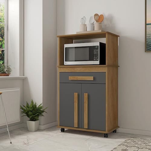 O Multiuso é prático, funcional e não ocupa muito espaço, ainda conta com nicho para Forno ou Microondas, tornando-o ainda mais útil.