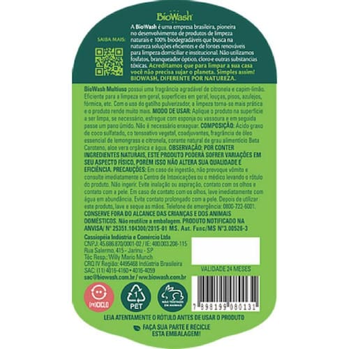 Ácido Graxo de Babaçu e Palma Saponificados, Extrato de Aloe Vera Certificada, Corante Caroteno, Óleo Essencial de Capim Limão, Óleo Essencial de Citronela e Ricinoleato de Sódio. Marca: Biowash Produtos De Limpeza Naturais E Biodeg