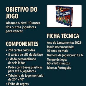 Mergulhe em partidas cheias de estratégia, humor e competição com este envolvente jogo de cartas com tabuleiro Ideal para jogar com amigos ou em família, ele oferece horas de diversão para 3 a 6 jogadores em disputas dinâmicas onde o objetivo é simples: subir de nível até alcançar o nível 10. Durante o jogo, os participantes enfrentam desafios, utilizam cartas especiais e interagem entre si - seja colaborando ou sabotando. Com 261 cartas ilustradas, tabuleiro temático, peões personalizados e dado exclusivo, cada partida se torna única e imprevisível. Este é o jogo ideal para quem busca diversão em grupo, com mecânicas estratégicas, reviravoltas inesperadas e muita interação social. Fácil de aprender, mas com muita profundidade , é perfeito para iniciantes e veteranos dos jogos de tabuleiro. Destaques do Produto Estimula o raciocínio lógico e a criatividade Ideal para adultos, adolescentes e toda a família Excelente opção de presente para quem ama jogos de tabuleiro Regras simples, partidas dinâmicas e muito envolvimento entre os jogadores Ficha Técnica Tipo de jogo: Jogo de cartas com tabuleiro Número de jogadores: 3 a 6 participantes Idade recomendada: A partir de 10 anos Tempo médio de jogo: 60 a 120 minutos Conteúdo da caixa: 261 cartas ilustradas 1 tabuleiro de jogo aprox. 50 x 25 cm 6 peões com base 1 dado personalizado Manual de instruções Idioma: Português Indicado para: Famílias, grupos de amigos, festas e encontros Homologação Inmetro: CE-BRI/IQB 005923 53374/19-038