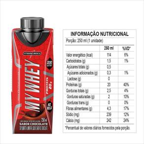 My whey é o proteico pronto para beber que possui uma fórmula premium, elaborada com proteínas de alta qualidade, e que não possui leite ou lactose em sua composição. My whey é um produto altamente proteico, com fontes de fibra, baixos teores de gordura e carboidratos, o que o torna ainda mais saudável e versátil para ser consumido á qualquer momento do dia. Com até 20 gramas de proteína e 8 gramas de aminoácidos essenciais por dose. Proteínas: my whey possui whey protein concentrado em sua composição proteica, que é uma proteína de alto valor nutricional. Aminoácidos essenciais: my whey possui 8g de aminoácidos essenciais. Esses aminoácidos não são produzidos pelo nosso organismo e por isso devem ser ingeridos pela dieta e/ou suplementação. Uma das principais funções dos aminoácidos é propiciar a construção muscular, por isso, para quem deseja o aumento de massa muscular é imprescindível o consumo em sua dieta.No milk: my whey não contém adição de leite em sua fórmula, e por isso é um produto seguro também para pessoas intolerantes à lactose. Além de ser o produto dessa categoria com a menor quantidade de carboidratos do mercado.Ingredientes:água, caseinato de cálcio, proteína de soro do leite concentrada, polidextrose, cacau, triglicerídeos de cadeia média, cloreto de sódio, reguladores de acidez fosfato dipotássico e fosfato dissódico, espessantes goma gelana e carragena e edulcorante sucralose. Ean: 7896311774050