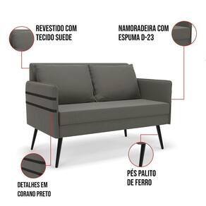 Que tal a Namoradeira Mari? Imagine-se utilizando esse produto e usufruindo de todos os benefícios que ela oferece. Usar essa Namoradeira é bem simples! Pode ser utilizada para evidenciar e enriquecer o seu ambiente, descansar depois de um dia longo de trabalho, ver aquela série favorita ou simplesmente ler seu livro predileto. Sua estrutura é confeccionada em madeira de eucalipto proveniente de reflorestamento, suportando em média até 120 Kg, possuí Pés Palito de Ferro, garantindo uma maior resistência e durabilidade ao produto, o estofamento do assento e encosto é composto de espuma D-23, revestido em tecido Suede no tom Grafite. Então, se a sua dificuldade é a otimização de espaço, esta namoradeira além de confortável e sofisticada, traz toda a funcionalidade que você precisa. Apenas algumas unidades estão disponíveis, separe o sua Namoradeira Mari antes que acabem! Dimensões da Namoradeira: Altura total: 82 cm Largura total: 110 cm Profundidade total: 74 cm Altura do encosto: 35 cm Largura do assento: 104 cm Profundidade do assento: 57 cm Altura do chão ao assento: 47 cm Espessura do assento: 22 cm Altura do chão ao braço: 46 cm Altura interna do braço: 19 cm Tamanho dos pés: 25 cm Espessura do braço: 4 cm Peso: 20 kg Dimensões da Almofada: Altura total: 34 cm Largura total: 51 cm Profundidade total: 20 cm Peso: 0,3 kg Especificações do Produto Estrutura: Madeira Eucalipto Espuma: D-23 Tecido: Suede Tipo de pés: Pés Palito de Ferro Peso suportado: Até 120 Kg Garantia: 90 dias contra defeito de fabricação Montagem: O produto vai montado, apenas rosquear os pés Instruções de limpeza: Utilizar um pano limpo e levemente úmido Você irá receber: 01 Volume com 01 Namoradeira Observações Relevantes - Todos os produtos vão embalados com total segurança; - As cores dos produtos podem sofrer alterações dependendo do seu monitor; - Para futuras compras, não garantimos a mesma tonalidade de cor, pois existe variação a cada lote do fabricante do tecido; - As imagens são meramente ilustrativas, não acompanham objetos de decoração e eletros; - Confira as dimensões do produto no momento da compra e certifique-se de que passará normalmente por escadas, elevadores, portas e corredores; - Importante: Por se tratar de estofado as medidas podem ter uma pequena variação em até 3 cm; - Não nos responsabilizamos no ato da entrega por montagens, desmontagens, instalações de produtos; - Não nos responsabilizamos no ato da entrega por subir escadas, elevadores, nem utilização de guinchos ou equipamentos similares para acesso a pisos superiores em apartamentos; - A entrega do produto é realizada em todo território nacional, até onde as rodovias alcançam, entregas fluviais ou aéreas devem ser cotadas a parte; - Observando as orientações acima, evita-se futuros desagrados ou imprevistos com a entrega do produto. Havendo despesas adicionais, serão de responsabilidade do cliente;