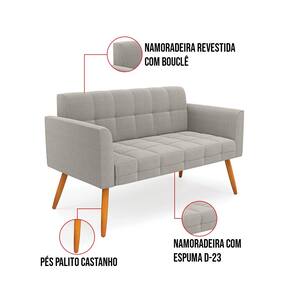 O Sofá Namoradeira 2 Lugares Elisa é uma mobília que combina elegância, conforto e durabilidade. Ele tem um design retrô e sofisticado, com Pés Palito Castanho e revestimento em tecido Bouclê Cinza, que harmonizam com qualquer ambiente. Ele é ideal para sala de estar, recepções, escritórios, cozinhas ou qualquer outro espaço que você queira decorar com estilo e bom gosto. Ele tem uma estrutura em madeira de reflorestamento eucalipto, que garante a resistência e a sustentabilidade do produto. Ele suporta até 180 kg de peso, podendo ser utilizada por pessoas de diferentes biotipos. Ele tem um acabamento reforçado e espuma de qualidade D23, que oferece maciez e aconchego. Ele contém detalhes de costura no encosto e assento, resultando em um acabamento impecável, conferindo muito mais valor e elegância ao produto. O Sofá Namoradeira Elisa é um móvel de alta qualidade, beleza e funcionalidade. Ele é fácil de transportar, pois tem um peso leve e um tamanho compacto. O Sofá Namoradeira Elisa é um produto que vai fazer a diferença na sua decoração e no seu bem-estar. Ele vai trazer charme, conforto e durabilidade para o seu ambiente. Aproveite essa oferta e leve para casa um Sofá Namoradeira de qualidade por um preço incrível. Essa é a sua chance de ter um Sofá Namoradeira maravilhoso por um preço imperdível. Corra e garanta o seu antes que acabe o estoque!