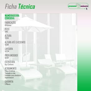 Seu assento e encosto sao estofado com tecido impermeavel proporciona maior conforto e praticidade, ideal para momentos de lazer e descontracao. Produzida de forma artesanal, a namoradeira Cordova combina elegancia e exclusividade no design. E uma excelente opcao para areas gourmet, espacos internos, churrasqueira, recepcao, ediculas e outros ambientes que pedem charme e aconchego.