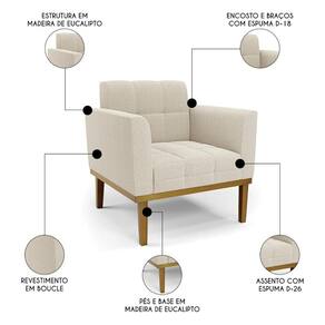 O Sofá Namoradeira e a Poltrona Para Sala são revestidos em Bouclé, que é confortável, suave ao toque, e valoriza o design das peças. Eles têm braços e encosto em espuma D-18 e assento em espuma D-26, que oferecem firmeza e aconchego para você relaxar. A base em madeira de eucalipto castanho é um detalhe charmoso, que dá um toque rústico e sofisticado ao conjunto. O kit tem uma estrutura resistente e suporta até 120 kg cada peça. A montagem é simples, pois as peças já vêm prontas, bastando fixar a base com os parafusos que acompanham o produto. A limpeza é prática, pois basta usar um pano limpo e levemente úmido, sem produtos abrasivos, para manter o seu kit sempre em bom estado. Hora de transformar seu ambiente com a Namoradeira 2 Lugares e a Poltrona para Sala deixando ainda mais confortável e estiloso.