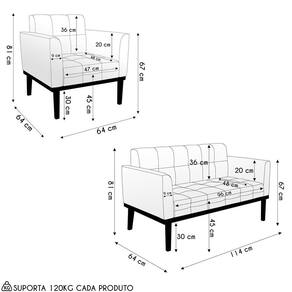 O Sofá Namoradeira e a Poltrona Para Sala são revestidos em Bouclé, que é confortável, suave ao toque, e valoriza o design das peças. Eles têm braços e encosto em espuma D-18 e assento em espuma D-26, que oferecem firmeza e aconchego para você relaxar. A base em madeira de eucalipto castanho é um detalhe charmoso, que dá um toque rústico e sofisticado ao conjunto. O kit tem uma estrutura resistente e suporta até 120 kg cada peça. A montagem é simples, pois as peças já vêm prontas, bastando fixar a base com os parafusos que acompanham o produto. A limpeza é prática, pois basta usar um pano limpo e levemente úmido, sem produtos abrasivos, para manter o seu kit sempre em bom estado. Hora de transformar seu ambiente com a Namoradeira 2 Lugares e a Poltrona para Sala deixando ainda mais confortável e estiloso.