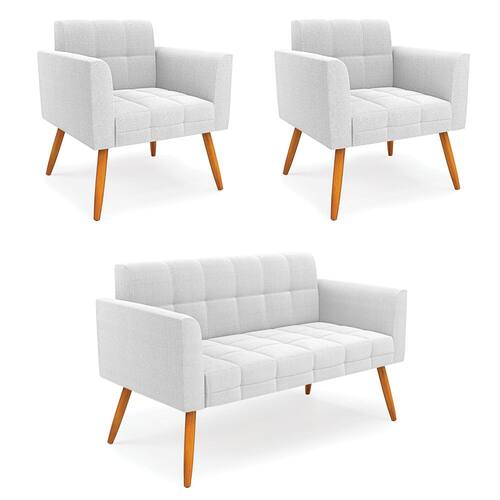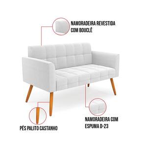 O Sofá Namoradeira e 2 Poltronas Elisa é uma mobília que combina elegância, conforto e durabilidade. Ele tem um design retrô e sofisticado, com Pés Palito Castanho e revestimento em tecido Bouclê Off White, que harmonizam com qualquer ambiente. Ele é ideal para sala de estar, recepções, escritórios, cozinhas ou qualquer outro espaço que você queira decorar com estilo e bom gosto. Ele tem uma estrutura em madeira de reflorestamento eucalipto, que garante a resistência e a sustentabilidade do produto. Ele suporta até 180 kg de peso, podendo ser utilizada por pessoas de diferentes biotipos. Ele tem um acabamento reforçado e espuma de qualidade D23, que oferece maciez e aconchego. Ele contém detalhes de costura no encosto e assento, resultando em um acabamento impecável, conferindo muito mais valor e elegância ao produto. O Sofá Namoradeira e 2 Poltronas Elisa é um móvel de alta qualidade, beleza e funcionalidade. Ele é fácil de transportar, pois tem um peso leve e um tamanho compacto. O Sofá Namoradeira e 2 Poltronas Elisa é um produto que vai fazer a diferença na sua decoração e no seu bem-estar. Ele vai trazer charme, conforto e durabilidade para o seu ambiente. Aproveite essa oferta e leve para casa um Sofá Namoradeira e 2 Poltronas de qualidade por um preço incrível. Essa é a sua chance de ter um Sofá Namoradeira e 2 Poltronas maravilhoso por um preço imperdível. Corra e garanta o seu antes que acabe o estoque!