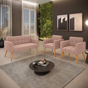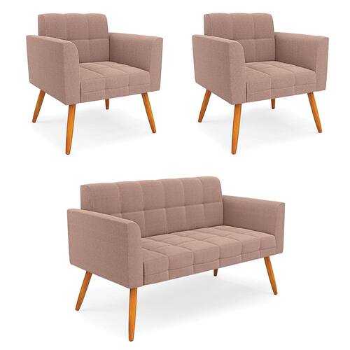 O Sofá Namoradeira e 2 Poltronas Elisa é uma mobília que combina elegância, conforto e durabilidade. Ele tem um design retrô e sofisticado, com Pés Palito Castanho e revestimento em tecido Bouclê Rosê, que harmonizam com qualquer ambiente. Ele é ideal para sala de estar, recepções, escritórios, cozinhas ou qualquer outro espaço que você queira decorar com estilo e bom gosto. Ele tem uma estrutura em madeira de reflorestamento eucalipto, que garante a resistência e a sustentabilidade do produto. Ele suporta até 180 kg de peso, podendo ser utilizada por pessoas de diferentes biotipos. Ele tem um acabamento reforçado e espuma de qualidade D23, que oferece maciez e aconchego. Ele contém detalhes de costura no encosto e assento, resultando em um acabamento impecável, conferindo muito mais valor e elegância ao produto. O Sofá Namoradeira e 2 Poltronas Elisa é um móvel de alta qualidade, beleza e funcionalidade. Ele é fácil de transportar, pois tem um peso leve e um tamanho compacto. O Sofá Namoradeira e 2 Poltronas Elisa é um produto que vai fazer a diferença na sua decoração e no seu bem-estar. Ele vai trazer charme, conforto e durabilidade para o seu ambiente. Aproveite essa oferta e leve para casa um Sofá Namoradeira e 2 Poltronas de qualidade por um preço incrível. Essa é a sua chance de ter um Sofá Namoradeira e 2 Poltronas maravilhoso por um preço imperdível. Corra e garanta o seu antes que acabe o estoque!