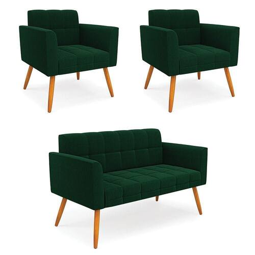 O Sofá Namoradeira e 2 Poltronas Elisa é uma mobília que combina elegância, conforto e durabilidade. Ele tem um design retrô e sofisticado, com Pés Palito Castanho e revestimento em tecido Bouclê Verde, que harmonizam com qualquer ambiente. Ele é ideal para sala de estar, recepções, escritórios, cozinhas ou qualquer outro espaço que você queira decorar com estilo e bom gosto. Ele tem uma estrutura em madeira de reflorestamento eucalipto, que garante a resistência e a sustentabilidade do produto. Ele suporta até 180 kg de peso, podendo ser utilizada por pessoas de diferentes biotipos. Ele tem um acabamento reforçado e espuma de qualidade D23, que oferece maciez e aconchego. Ele contém detalhes de costura no encosto e assento, resultando em um acabamento impecável, conferindo muito mais valor e elegância ao produto. O Sofá Namoradeira e 2 Poltronas Elisa é um móvel de alta qualidade, beleza e funcionalidade. Ele é fácil de transportar, pois tem um peso leve e um tamanho compacto. O Sofá Namoradeira e 2 Poltronas Elisa é um produto que vai fazer a diferença na sua decoração e no seu bem-estar. Ele vai trazer charme, conforto e durabilidade para o seu ambiente. Aproveite essa oferta e leve para casa um Sofá Namoradeira e 2 Poltronas de qualidade por um preço incrível. Essa é a sua chance de ter um Sofá Namoradeira e 2 Poltronas maravilhoso por um preço imperdível. Corra e garanta o seu antes que acabe o estoque!