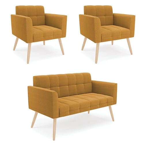 O Sofá Namoradeira e 2 Poltronas Elisa é uma mobília que combina elegância, conforto e durabilidade. Ele tem um design retrô e sofisticado, com Pés Palito Natural e revestimento em tecido Bouclê Mostarda, que harmonizam com qualquer ambiente. Ele é ideal para sala de estar, recepções, escritórios, cozinhas ou qualquer outro espaço que você queira decorar com estilo e bom gosto. Ele tem uma estrutura em madeira de reflorestamento eucalipto, que garante a resistência e a sustentabilidade do produto. Ele suporta até 180 kg de peso, podendo ser utilizada por pessoas de diferentes biotipos. Ele tem um acabamento reforçado e espuma de qualidade D23, que oferece maciez e aconchego. Ele contém detalhes de costura no encosto e assento, resultando em um acabamento impecável, conferindo muito mais valor e elegância ao produto. O Sofá Namoradeira e 2 Poltronas Elisa é um móvel de alta qualidade, beleza e funcionalidade. Ele é fácil de transportar, pois tem um peso leve e um tamanho compacto. O Sofá Namoradeira e 2 Poltronas Elisa é um produto que vai fazer a diferença na sua decoração e no seu bem-estar. Ele vai trazer charme, conforto e durabilidade para o seu ambiente. Aproveite essa oferta e leve para casa um Sofá Namoradeira e 2 Poltronas de qualidade por um preço incrível. Essa é a sua chance de ter um Sofá Namoradeira e 2 Poltronas maravilhoso por um preço imperdível. Corra e garanta o seu antes que acabe o estoque!