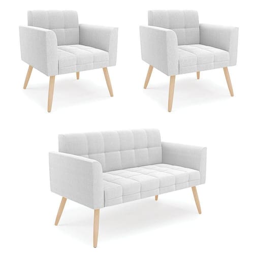 O Sofá Namoradeira e 2 Poltronas Elisa é uma mobília que combina elegância, conforto e durabilidade. Ele tem um design retrô e sofisticado, com Pés Palito Natural e revestimento em tecido Bouclê Off White, que harmonizam com qualquer ambiente. Ele é ideal para sala de estar, recepções, escritórios, cozinhas ou qualquer outro espaço que você queira decorar com estilo e bom gosto. Ele tem uma estrutura em madeira de reflorestamento eucalipto, que garante a resistência e a sustentabilidade do produto. Ele suporta até 180 kg de peso, podendo ser utilizada por pessoas de diferentes biotipos. Ele tem um acabamento reforçado e espuma de qualidade D23, que oferece maciez e aconchego. Ele contém detalhes de costura no encosto e assento, resultando em um acabamento impecável, conferindo muito mais valor e elegância ao produto. O Sofá Namoradeira e 2 Poltronas Elisa é um móvel de alta qualidade, beleza e funcionalidade. Ele é fácil de transportar, pois tem um peso leve e um tamanho compacto. O Sofá Namoradeira e 2 Poltronas Elisa é um produto que vai fazer a diferença na sua decoração e no seu bem-estar. Ele vai trazer charme, conforto e durabilidade para o seu ambiente. Aproveite essa oferta e leve para casa um Sofá Namoradeira e 2 Poltronas de qualidade por um preço incrível. Essa é a sua chance de ter um Sofá Namoradeira e 2 Poltronas maravilhoso por um preço imperdível. Corra e garanta o seu antes que acabe o estoque!