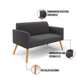O Sofá Namoradeira e Poltrona Marisa é a escolha perfeita para quem deseja unir conforto e comodidade em um estilo elegante. Com um design único, ele possui Pés Palito Castanho que harmoniza com o seu belíssimo tom Grafite, criando uma combinação elegante de conforto e estilo. Ele é perfeito para quem busca móveis que não só sejam bonitos, mas que também proporcionem bem-estar. Ideal para compor salas de estar, recepções, bibliotecas, salas de leitura, espaços de design e até áreas comerciais, essa peça versátil é pensada para ambientes que excluam beleza e aconchego. Sua estrutura, em madeira de reflorestamento de eucalipto, oferece resistência e sustentabilidade, suportando até 180 kg, garantindo segurança para usuários de diferentes biotipos. O conforto é outro destaque, com estofado em espuma prorelax D-23, que proporciona suporte e maciez ideais. Revestido em Bouclê, um tecido maleável e sofisticado, Sofá Namoradeira e Poltrona Marisa segue a tendência do momento com um toque suave e quente, remetendo à textura natural da lã. Leve e fácil de transportar, o Sofá Namoradeira e Poltrona é um item que agrega charme e durabilidade ao seu espaço. Não perca a oportunidade de adquirir essa peça exclusiva que fará toda a diferença na sua decoração e no seu bem-estar. Aproveite agora!
