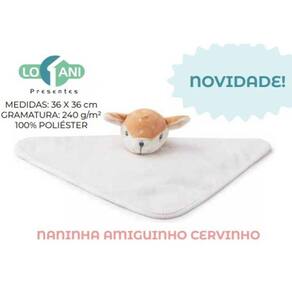 Naninha Amiguinho Cervinho Creme 36x36cm - Loani Informação do produto: A naninha de bebê da Loani é o amiguinho perfeito para ajudar o bebê a se divertir e pegar no sono, proporcionando muito conforto e aconchego. Ajuda a criança a desenvolver o vínculo afetivo e obter o primeiro amiguinho, trazendo estimulo visual, tátil, auditiva, criativa e motora. Composição: Tecido em plush Enchimento em fibra 100% poliéster Recomendação: Indicado para recém nascido Medidas: axl 11x36x36cm Conteúdo da embalagem: 1 Naninha Loja da JUX