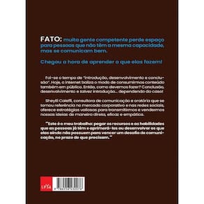 S heylli Caleffi, consultora de comunicação e oratória, apresenta um guia com estratégias práticas e dinâmicas para fisgar o interesse do público tanto on-line quanto presencialmente. Foi-se o tempo de “introdução, desenvolvimento e conclusão”. Hoje, a internet baliza o modo de consumirmos conteúdo também em público. Então, como devemos fazer? Conclusão, desenvolvimento e talvez introdução… dependendo do caso! Sheylli Caleffi, consultora de comunicação e oratória que se tornou referência no mercado corporativo e nas redes sociais, oferece estratégias valiosas para você transmitir e vender suas ideias de maneira direta, eficaz e empática, seja numa apresentação de apenas cinco minutos diante de um grupo pequeno ou num TED Talk de meia hora para um auditório lotado. Para isso, Sheylli utiliza uma metodologia que desenvolveu ao longo de vinte anos treinando empresários, artistas, porta-vozes de empresas, líderes, empreendedores, palestrantes, participantes de realities shows, apresentadores de tevê, podcasters e professores. Não, não é mágica. Mas tem, sim, receita de bolo. Anote aí: os ingredientes são o conteúdo a ser abordado, enquanto o modo de preparo é o formato escolhido para transmitir essas ideias. Como em toda receita campeã, a maneira de servir também é fundamental – eis a importância da performance. Este livro ensina – por meio de estratégias, técnicas, dicas, exemplos e exercícios práticos – como equilibrar esses três pilares, auxiliando você a controlar o nervosismo, a otimizar o tempo e a se preparar para uma apresentação importante. Ou, simplesmente, a se comunicar melhor com as pessoas.