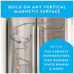 Este conjunto de construção magnética de mármore da marca Blue Marble, patenteado e apoiado por milhares no Kickstarter, é um verdadeiro sucesso! Com uma pista e truques únicos, você pode ajustar e adicionar novos caminhos emocionantes. Inclui elevador motorizado, 70 conectores de pista, 32 peças especiais, 25 mármores e muito mais para infinitas combinações e diversão criativa. Construa em superfícies magnéticas verticais, como geladeiras, armários e lousas. Conectores de encaixe seguro e instruções detalhadas tornam a montagem fácil. Vencedor do prêmio Toy of the Year Award!