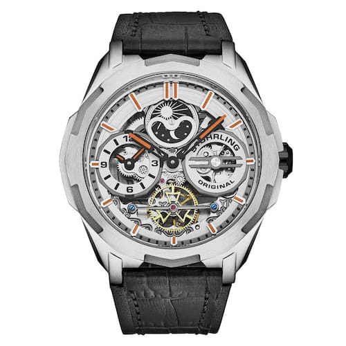 O relógio Dual Time Automático Navigator é uma obra-prima da relojoaria, com uma caixa de aço inoxidável de 46 mm que abriga um movimento automático intricado, que vibra a 21.600 vezes por hora e é adornado com 22 joias para melhor desempenho. Com capacidade de tempo duplo e indicador de fases da lua, este relógio oferece funcionalidade e beleza em um design perfeito. A caixa de exposição permite uma visão íntima do funcionamento interno do relógio, enquanto a pulseira dupla de couro premium com fivela segura combina conforto com um design clássico. Este relógio é ideal para entusiastas globais que buscam sofisticação e utilidade em um só produto.