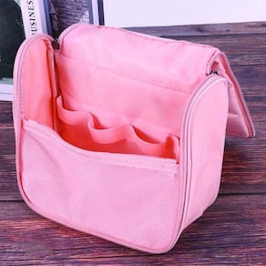 Tem vários bolsos para armazenar shampoo, condicionador, sabonete, pente ou escova de cabelo, escola e pasta de dentes, saboneteira com sabonete, perfume, desodorante entre outros itens.