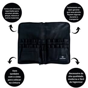 Com acabamento brilhante e resistente, a nova necessaire KC-01 veio para deixar ainda mais brilhante e seguro o transporte de seu material. Contando com diversas repartições para encaixar pincéis, pinças, tesoura e outros materiais, contando também com o cinto para colocar na cintura. Possui um amplo espaço para acomodar pincéis de todos os tamanhos. Fechamento em zíper garante que seus pincéis fiquem seguros durante o transporte. Necessaire de alta qualidade, moderna e fácil de higienizar.