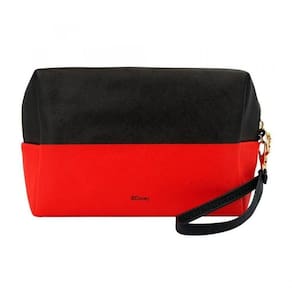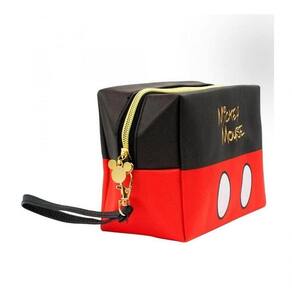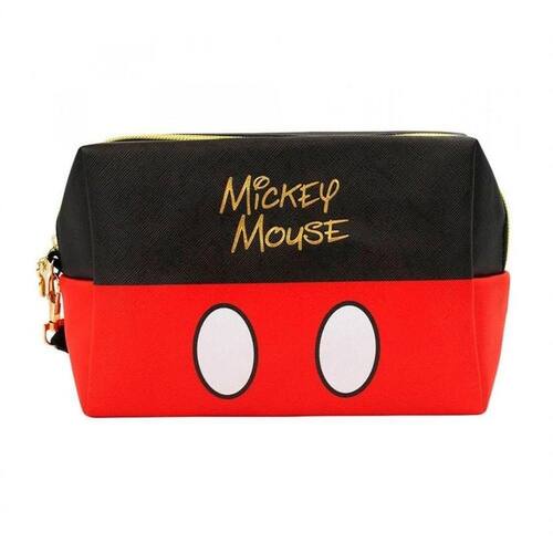 Necessaire retangular com 13x10x20 cm de dimensão, estampado com cores e assinatura do Mickey. Alça removível com zíper na cor dourada.