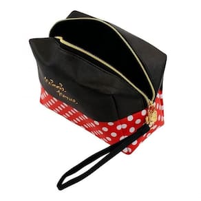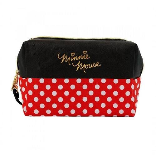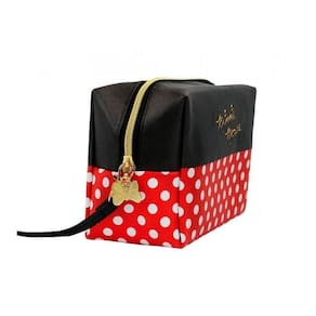 Necessaire retangular com 13x10x20 cm de dimensão, estampado com cores e assinatura da Minnie. Alça removível com zíper na cor dourada.