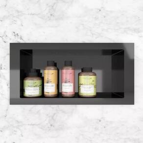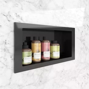 Nicho embutido fabricado em PSAI preto com acabamento brilhante, ideal para banheiros. É a solução perfeita para organização, design e praticidade no seu banheiro. Resistente à umidade e de fácil limpeza, seu design minimalista complementa diferentes estilos de decoração.