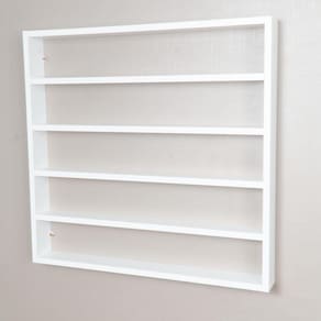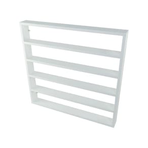 Produzido em MDF branco tx, espessura 15mm 5 Unidades Dimensões: 67cm largura x 64cm altura x 7cm profundidade Para fixação na parede, acompanha suportes, parafusos e buchas Cabe até 200 esmaltes, dependendo do tamanho deles. Não possui fundo. Cor: Branco Enviamos desmontado. Montagem fácil.