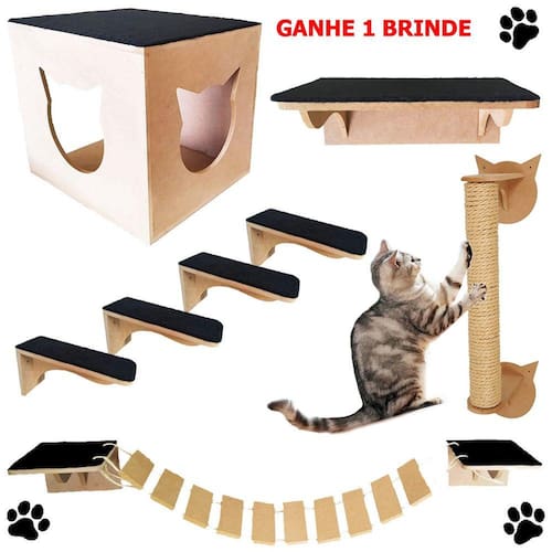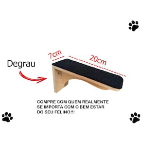 Sabemos que os gatos precisam gastar sua energia para se sentirem felizes. Que tal transformar sua casa num verdadeiro parque de diversões? Pensando nisso, A STILO MDF preparou vários produtos para o conforto e estimulação dos bichanos... Projetamos lindas peças e super fáceis de montar!!!Use sua criatividade e a diversão será garantida além de fazer parte da decoração de sua casa...O KIT CONTÉM:1 PRATELEIRA1 NICHO1 PONTE4 DEGRAUS1 ARRANHADORATENÇÃONÃO ACOMPANHA BUCHAS E PARAFOSOSNichoOs nichos funcionam como refúgio para os gatinhos. Lá, eles podem descansar e observar toda a movimentação da casa, por isso é ideal que sejam instalados na parte mais alta do parquinho.Comprimento 30 cmAltura 31 cmProfundidade 35 cmPeso 3kgPrateleirasAs prateleiras têm área útil suficiente para que o gatinho possa ficar de pé, sentado ou deitado, funcionando como pontos de parada ou de passagem para o acesso aos demais módulos. Todas têm a superfície revestida com um carpete, o que evita derrapagens. Comprimento 30 cmLargura 20cmPeso 766 kgDegraus EscadasAs escadinhas ajudam na parte de movimento em saltos dos gatinhos proporcionando diversão aos felinos. São excelentes opções para quem possui pouco espaço, trazendo a diversão completa!Degraus - 07x20Ponte com prateleiraTodo gatinho aventureiro precisa de uma Ponte para exercitar seus instintos felinos mais primitivos com toda a segurança e conforto que a seu Gatinho merece. Além disso, interligam módulos e prateleiras, trazendo a diversão completa!1 Metro de ponte ligando uma prateleira na outra com profundidade de 15 cm.Arranhador para Gatos vertical de parede em MDFJá vai com furação para instalação na parede.MEDIDASAltura: 50 cmLargura: 16 cmProfundidade: 23 cmObs: Contamos com várias opções em kits, se quiser montar algo para seu espaço, montamos um kit especial para sua necessidade!!! STILO MDF é uma empresa que preza pela qualidade e principalmente na comodidade e conforto dos FELINOS.A vantagem de comprar online é a praticidade, ou seja, comprar no conforto de sua casa, sem precisar se locomover, além de ter um atendimento exclusivo online. Desde já agradecemos sua parceria. Faça seu pequeno(a) mais feliz!Qualquer dúvida estamos à disposição.BOAS COMPRAS!!!