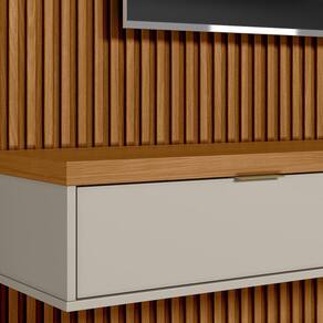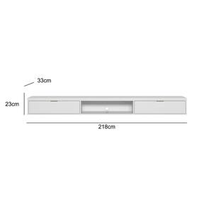 Espaço de TV no tampo: 2,18m de largura Tamanho de TV recomendado no tampo : 65 polegadas Nicho : 1 nicho Passa fio: 1 Tampo : MDP com espessura de 37mm Porta : 2 portas basculantes em MDP Puxador : 2 puxadores de alumínio Dobradiças : 4 dobradiças metálica Demais acessórios : 2 pistão a gás