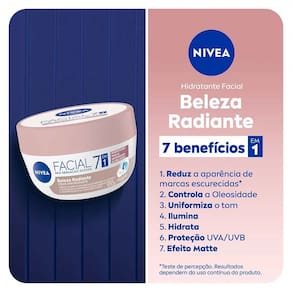 Para que serve? Sua fórmula única contém ingredientes como Ácido Hialurônico, Extrato de Pérolas e Cúrcuma, que proporcionam benefícios incríveis para a pele. Este hidratante oferece 7 benefícios em 1 só produto: reduz a aparência de marcas escurecidas, controla a oleosidade, uniformiza o tom de pele, ilumina, hidrata, possui proteção UVA/UVB e proporciona um efeito matte. A textura leve e de rápida absorção do NIVEA Hidratante Facial 7 em 1 Beleza Radiante permite uma aplicação diária no rosto limpo.