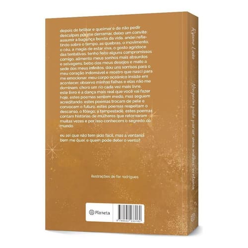 da autora dos best-sellers tudo nela brilha e queima e jamais peço desculpas por me derramar depois de brilhar e queimar e de não pedir desculpas por me derramar, deixo um convite: assumir a bagunça bonita da vida. andei refletindo sobre o tempo, as quebras, o movimento, o céu, a magia de estar viva, o gosto agridoce das tentativas. tenho feito alguns compromissos comigo. alimento meus sonhos mais absurdos e selvagens. bebo dos meus desejos e mato a sede dos meus infinitos. dou uns sorrisos para o meu coração indomável e mostro que nasci para me emocionar. meu corpo oceânico insiste em acontecer. observo minhas falhas e elas não me dominam. choro um rio cada vez mais livre. este livro é a dança mais real que você vai fazer hoje. estes poemas sentem medo, mas seguem acreditando. estes poemas trocam de pele e convocam o futuro. estes poemas respeitam o descanso, o fôlego, a tempestade. estes poemas contam histórias de mulheres que retornaram muitas vezes e por isso conhecem o segredo do mundo. eu sei que não tem sido fácil, mas a ventania bem me quer. e quem pode deter o vento? ilustrações de Fer Rodrigues