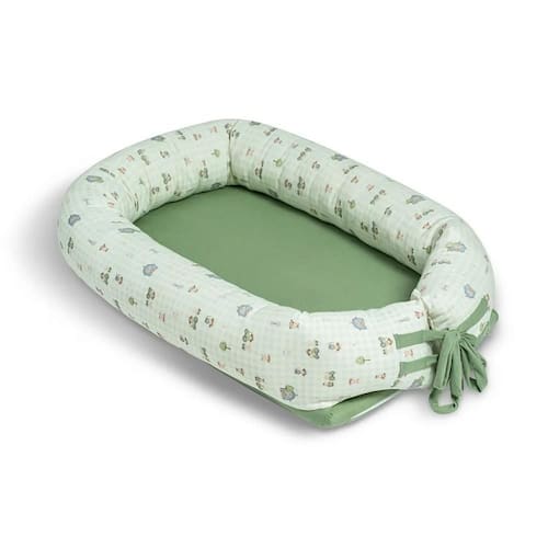 Devido as almofadas que formam uma barreira em volta do corpinho, seu bebê fica seguro, tem um sono super tranquilo e não corre riscos de bater nas laterais do berço e rolar da cama. Sempre nesse formato, super macio e confortável, os ninhos são produzidos em tecido suedine 100% algodão. Assim, evita o surgimento de possíveis alergias na pele do bebê, bordado exclusivo HUG, centro sem enchimento para não deformar a moleira do bebê, suedine com nanotecnologia que agrega maciez e tratamento antibacteriano e antifúngico. Forro lateral em TNT, enchimento do rolo lateral em fibra.