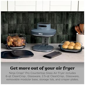 O Ninja Crispi Pro AS101CY é um sistema de fritadeira de ar elétrica 6-em-1 com potência de 1500 W e voltagem de 120 V, projetado para cozimento versátil em recipientes de vidro CleanCrisp resistentes a choque térmico. Equipado com base modular ajustável, suporta potes de vidro de 2,5 qt (2,37 L), 4 qt (3,78 L) e 6 qt (5,68 L), além de placas crispi e tampas de armazenamento com vedação snap-lock à prova de vazamentos para preparo e conservação de alimentos.