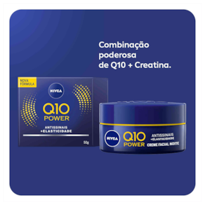 O Creme Noturno Facial NIVEA Q10 Power Plus Antissinais traz uma fórmula exclusiva, que combina a tecnologia MaxCreatina Ativa e Q10, capaz de atuar efetivamente contra os sinais da idade e garantir uma pele revitalizada, com textura mais firme, hidratada e iluminada.