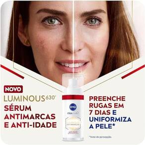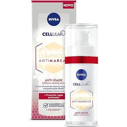NIVEA Sérum Facial Cellular Luminous 630 ANTIMARCAS Anti-idade 30mln Uso em pele íntegra. Evite contato direto com os olhos. Caso aconteça, enxágue com água em abundância. Em caso de irritação, suspenda o uso e procure orientação médica. Uso externo. Manter em local seco e arejado, ao abrigo de luz e fora do alcance de crianças. A eficácia do produto depende do uso nas condições indicadas no rótulo. Não usar em crianças. Não use em espinhas inflamadas. Não armazene acima de 30C.