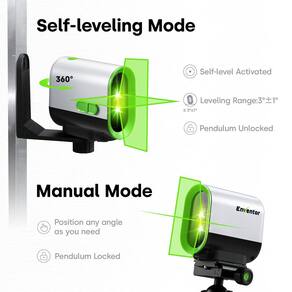 ?Proteção avançada e longo tempo de trabalho?: Classe II, < classe de proteção 1 mW, IP54 (à prova de choque, impermeável e à prova de poeira, usável, à prova de choque, resistente ao frio e a altas temperaturas). Com uma bateria de lítio recarregável por USB de 2200 mAh, a laser Levels Self Leveling suporta o dispositivo para durar 7 horas. - ?Alta visibilidade e precisão?: Esta versão atualizada de autonivelamento a laser para ajustar facilmente a ferramenta laser de linha cruzada. O nível de laser profissional tem uma precisão de nivelamento de ± 3 mm a 10 m. Esta ferramenta niveladora Lazer também é ótima para pisos, instalar fotos, portas, janelas ou marcenaria de móveis, pendurar papel de parede, etc. - ?Modo autonivelante, modo manual e modos de pulso?: Este nível de lazer verde tem um interruptor deslizante que permite alternar entre linhas verticais e horizontais, ou abrir simultaneamente. Ao operar no modo autonivelante, nivelamento de 3 ° ± 1 ° e intervalo de compensação, o tempo de nivelamento e compensação é inferior a 4 segundos. No modo manual, a função de autonivelamento é desativada e a cruz é bloqueada. Você pode usar o detector a laser para estender o alcance do laser para 50 m/50 m no modo pulsado. - ?Proteção avançada e longo tempo de trabalho?: Classe II, < classe de proteção 1 mW, IP54 (à prova de choque, impermeável e à prova de poeira, usável, à prova de choque, resistente ao frio e altas temperaturas). Com uma bateria de lítio recarregável por USB de 2200 mAh, o autonivelamento de níveis a laser suporta o dispositivo para durar 7 horas. - ?Suporte magnético em forma de L?: Esta ferramenta a laser de 2 linhas inclui um suporte magnético em forma de L para fixar em superfícies metálicas e girar o nível do laser. O nível de laser autonivelante também oferece roscas de montagem de 1/4 de polegada - 20 para se adequar a suportes padrão de tripé ou mastro de laser. Além disso, o design compacto torna a ferramenta a laser mais prática e moderna. - ?O pacote inclui garantia?: 1 ferramenta de nível de laser verde, 1 suporte magnético de 360°, 1 bolsa de pano, 1 placa de alvo a laser, 1 x manual do usuário (sem garantia de versão em português). Melhores níveis de laser para construtores, proprietários, artesãos e bricolage em geral.